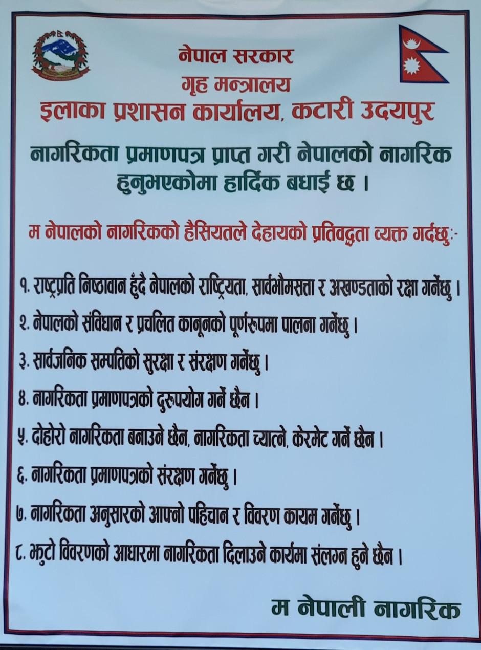मिति २०८२।४।५ - नयाँ नागरिकता प्रमाणपत्र लिने नागरिकका लागि नागरिक प्रतिवद्धता स्व-घोषणा लागू