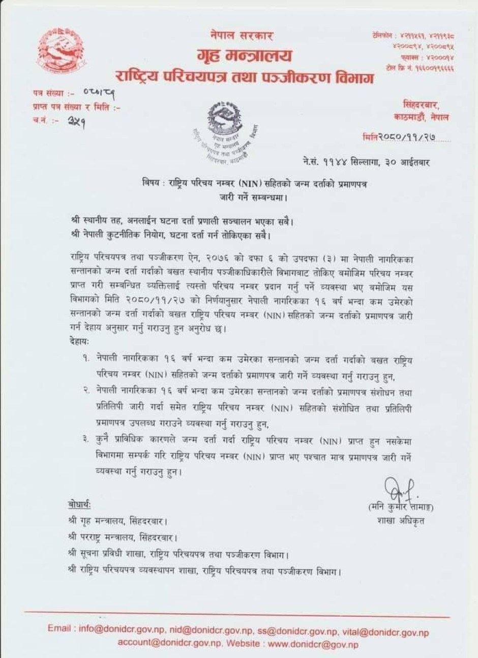अबदेखि राष्ट्रिय परिचय नम्बरसहितको जन्म दर्ता प्रमाणपत्र जारी हुने