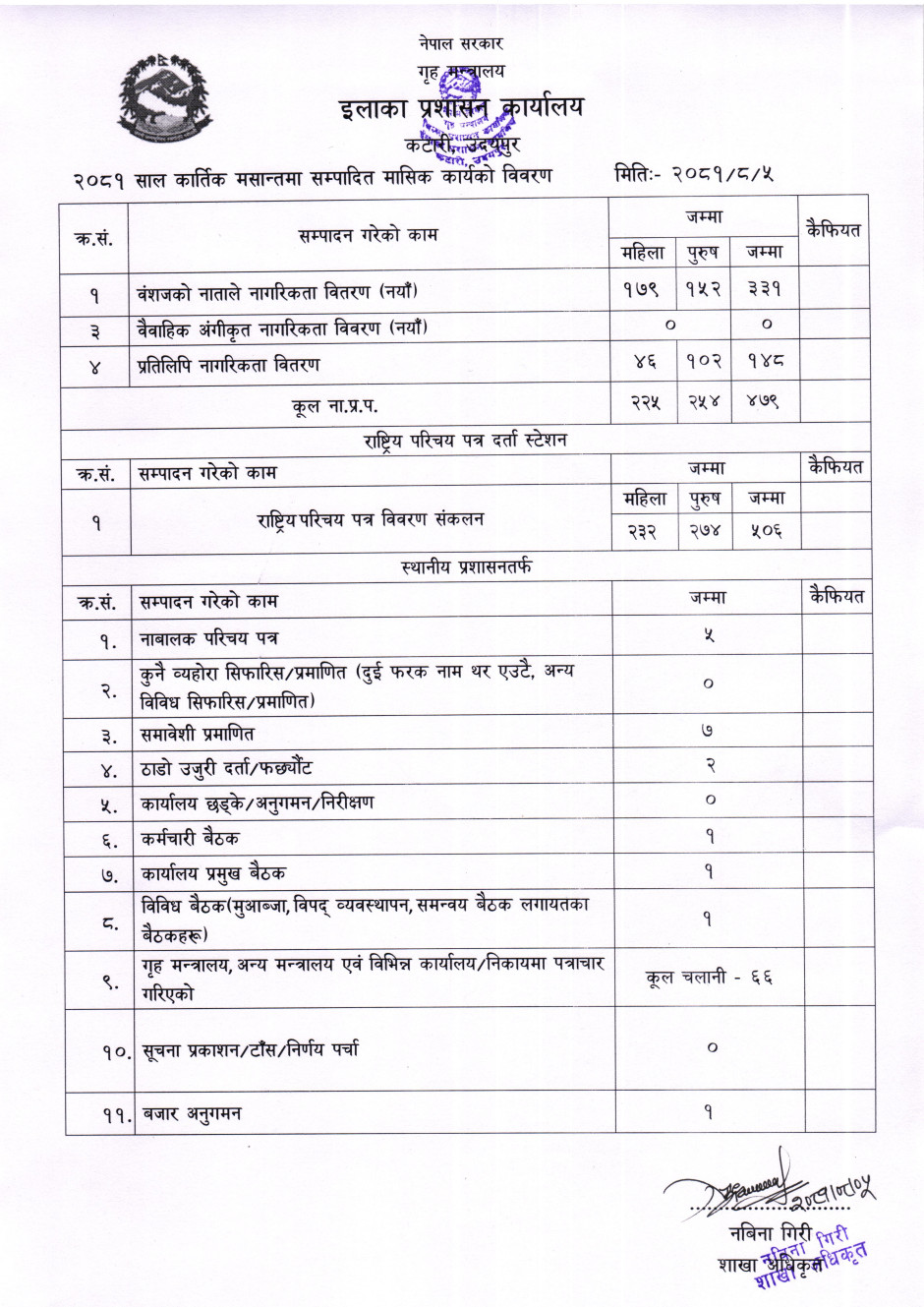 २०८१ साल कार्तिक मसान्तको मासिक कार्य विवरण