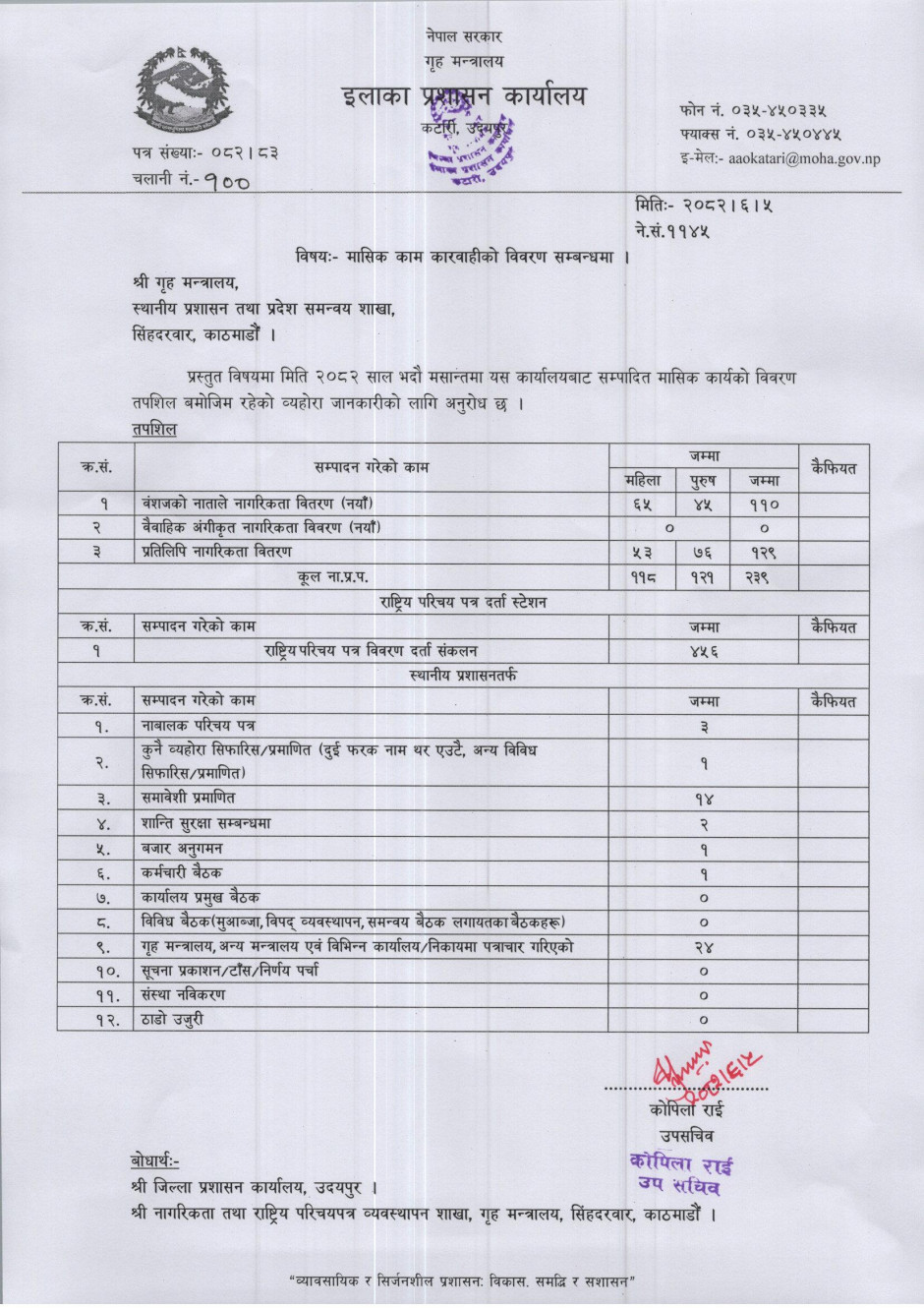 २०८२ साल असोज मसान्तको मासिक कार्य विवरण