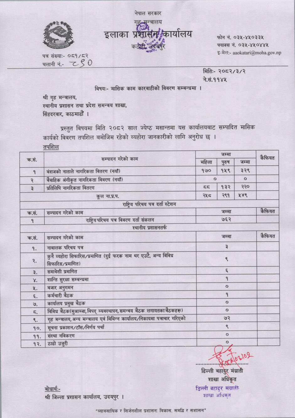 २०८२ साल असोज मसान्तको मासिक कार्य विवरण