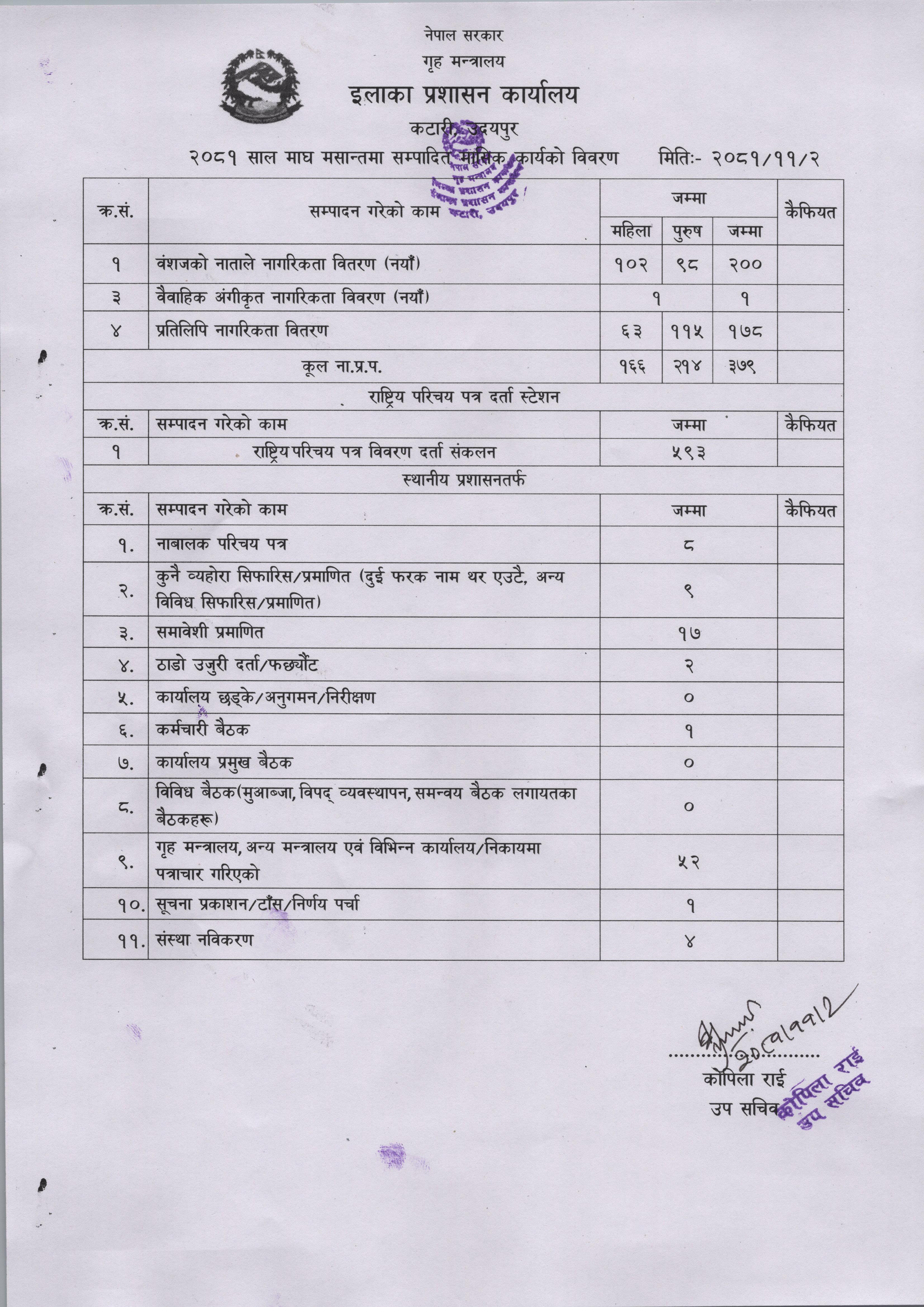 २०८२ साल माघ मसान्तको मासिक कार्य विवरण