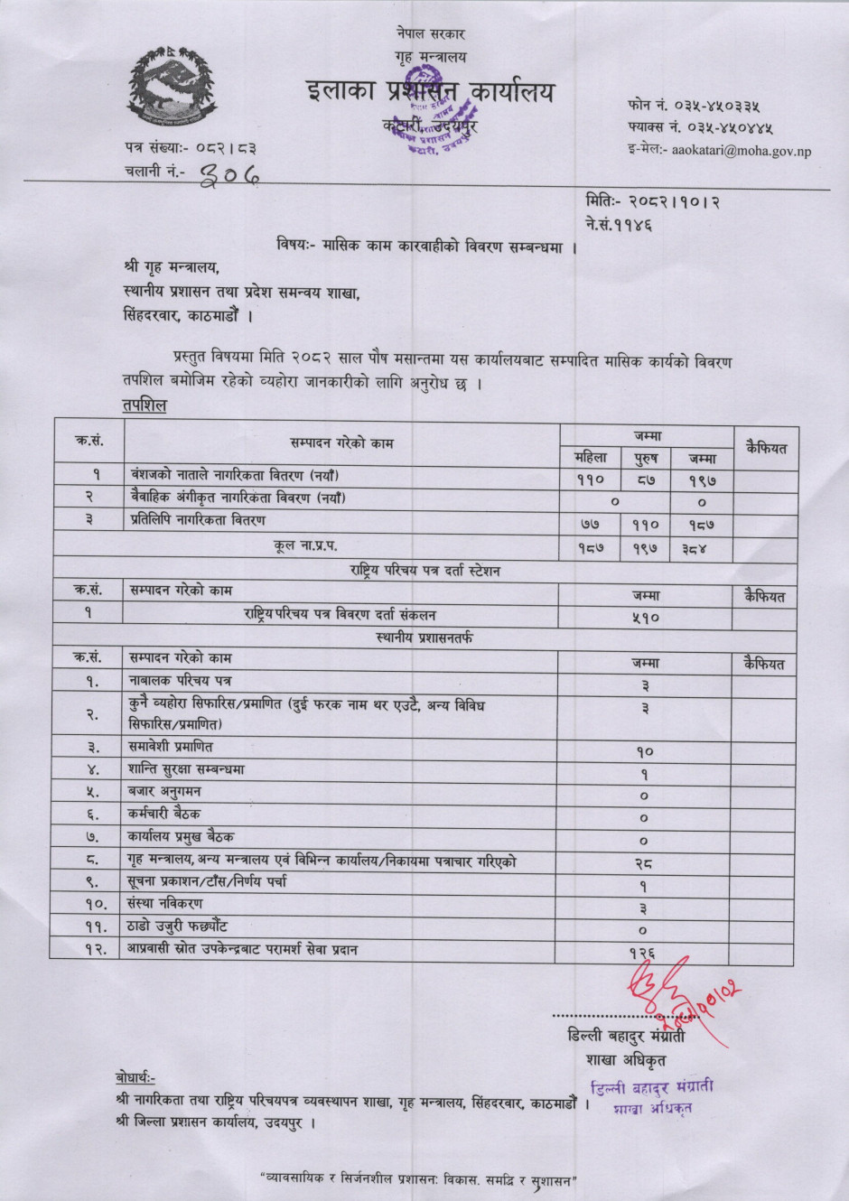 २०८२ साल असोज मसान्तको मासिक कार्य विवरण